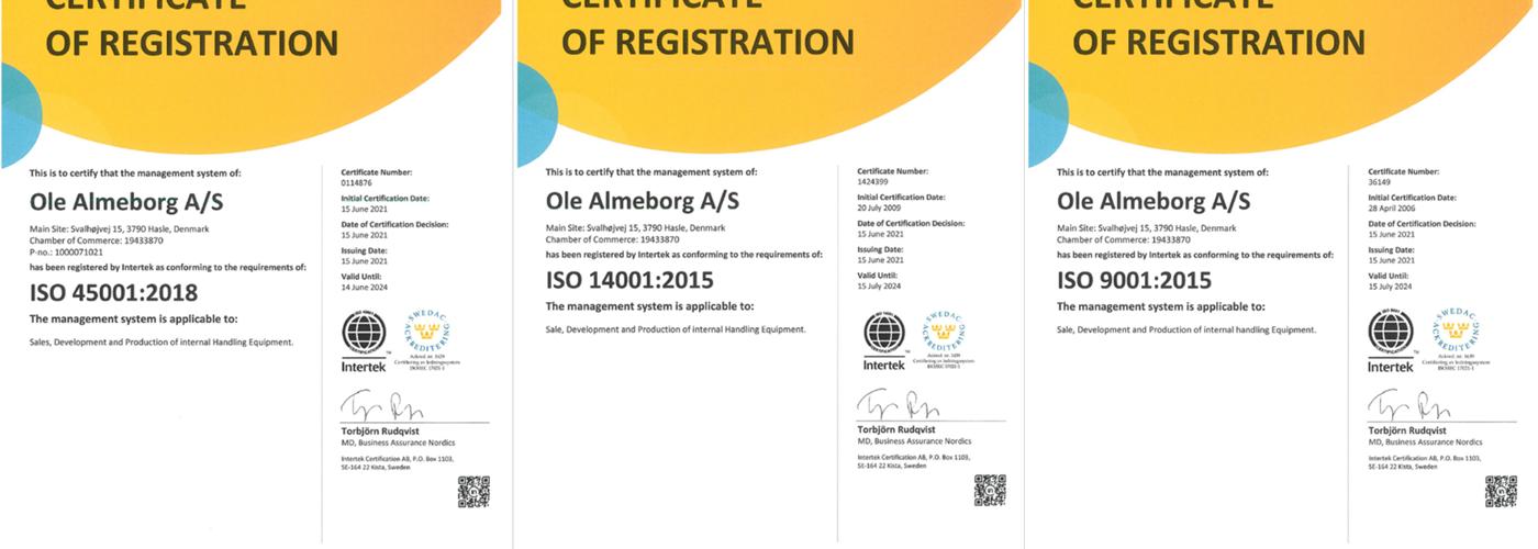 Almeborg er en sund og sikker arbejdsplads med et godt arbejdsmiljøledelsessystem. Det er konklusionen på seneste ISO 45001 certifikat, som vi netop har modtaget. Intertek har stået for certificeringen, og roser os for ikke at have nogle anmærkninger, hvilket er usædvanligt, når der er tale om tre standarder ISO 9001 (Kvalitet), ISO 14001 (Miljø) og senest ISO 45001 (Arbejdsmiljø).